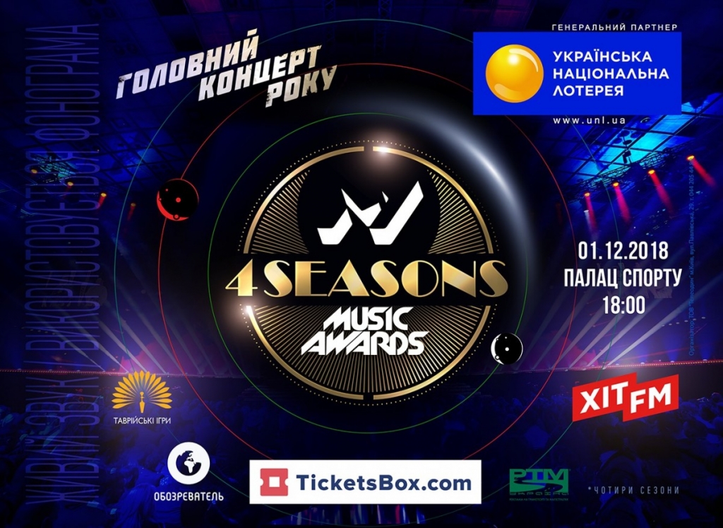 1 декабря во Дворце спорта в Киеве состоится “M1 Music Awards. 4 Seasons” — четвёртая церемония награждения премии “M1 Music Awards”. В масштабном гала-концерте свои эксклюзивные концертные номера представят Тина Кароль, “Время и Стекло”, MONATIK, NK | Настя Каменских, Alyosha, ALEKSEEV, THE HARDKISS, Michelle Andrade, Ирина Билык, “Mozgi”, NIKITA LOMAKIN, KADNAY, MARUV, Оля Цыбульская, KAZKA, Александр Пономарёв и “Антитіла”. Музыкальным продюсером премии стала известная певица, обладательница четырёх наград “М1 Music Awards” Тина Кароль.