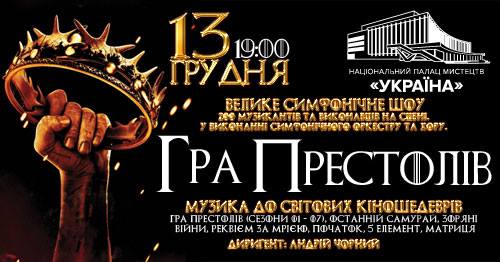 13 декабря 2017 в рамках всеукраинского тура в Национальном дворце искусств «Украина» новый масштабный музыкальный проект в этом году «Игра престолов» — симфоническое шоу в мировых киношедевров в исполнении оркестра и хора.