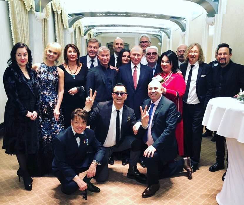 На фотографии Владимир Владимирович улыбается в окружении Валерии и Иосифа Пригожина, Льва Лещенко, Олега Газманова, Игоря Крутого, Александра Маршала, Владимира Винокура, Надежды Бабкиной, Александра Розенбаума, Игоря Николаева, Стаса Михайлова, Александра Буйнова, Тамары Гвардцители и дизайнера Валентина Юдашкина. А певица с украинскими корнями Наташа Королева и вовсе практически положила голову на плечо президента России.