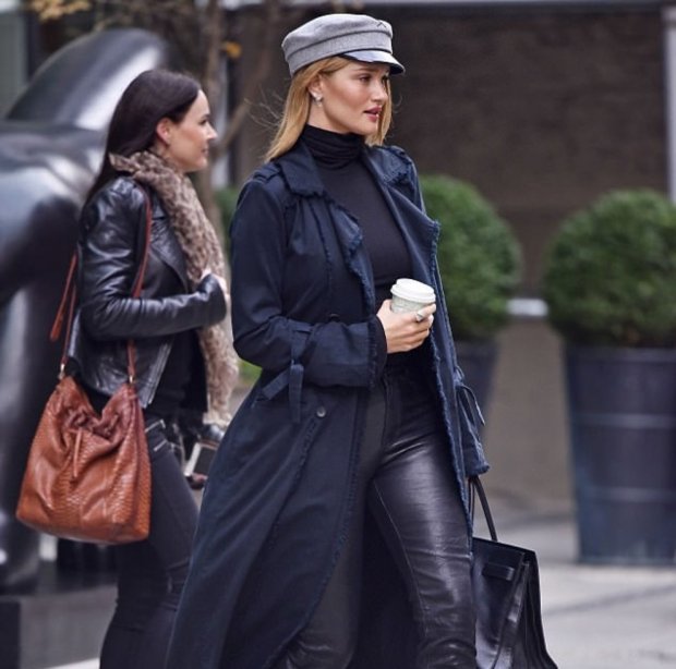 Серую фуражку модель соединила с любимым повседневным комплектом, состоящим из узких кожаных брюк и замшевых ботильонов на каблуке.