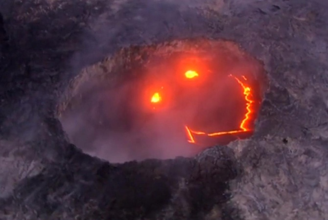 Канал Euronews показал потоки лавы, которые вытекают из вулкана Килауэа на Гавайях. Если посмотреть на вулкан с воздуха, можно увидеть, как лава изобразила смайлик 🙂