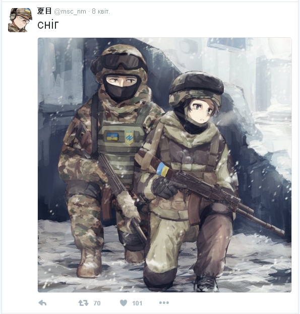 Японский художник, автор профиля 夏 目, прописанного в сети Twitter как «@msc_nm», рисует персонажей украинско-российской войны. Его героями являются ребята из шевронами СБУ, батальонов Донбасс, Азов.