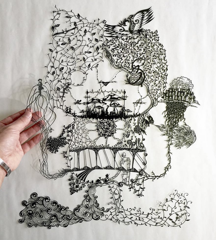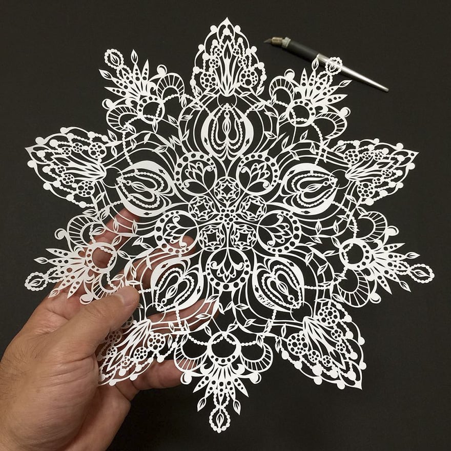 Экстраординарные узоры художник вырезает только вручную с помощью канцелярского ножа и на создание ажурных орнаментов уходит от нескольких часов до нескольких дней. Прежде чем приступить к отсечению лишней бумаги, художник рисует картину в технике зентангл, которая подразумевает создание рисунка на основе повторяющихся узоров, пишет Bored Panda.