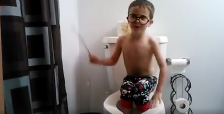 На записи видно, как женщина, предположительно мать ребенка, открывает дверь в ванную комнату. Там мальчик в круглых очках и с волшебной палочкой в руках стоит в унитазе, спуская воду.