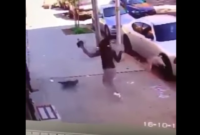 Вместо того, чтобы взять животное на руки, женщина крутит его на поводке, затем выбрасывает собаку в сторону. Кошке все-таки удаётся схватить измученного пса.