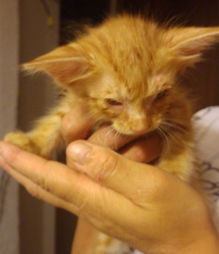 Тогда кому-то пришла в голову идея использовать ту же методику, что и раньше, только наклонить верх будки, подняв ее снизу. И котёнок смог выбраться! Когда женщина впервые его увидела, то отметила, какой он страшненький. И вот, прошло время, а котенок превратился в очень красивого рыжего кота!