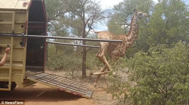 Первый жираф, который поспешно выбежал из трейлера, сразу же споткнулся об собственные ноги и упал. Другой жираф оказался проворнее и побежал в направлении деревьев сразу же за ним. Первый хотел сразу же встать, но его друг снова ему помешал.