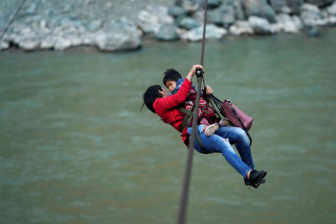 Жители китайской горной деревни Лазими (Lazimi) из-за отсутствия моста регулярно перебираются через реку, зацепившись за протянутый над ней стальной трос. Для местных способ является единственным, чтобы попасть в город.