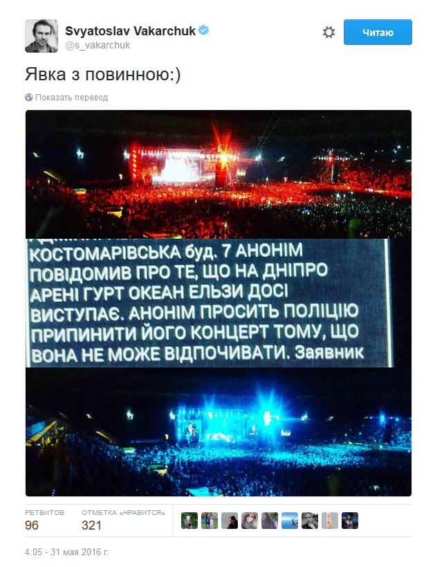 Позже Вакарчук с юмором добавил: «А если серьезно, дорогие наши поклонники: приходите на концерты вовремя, даже заранее. Так мы сможем начать раньше, и завершить не поз дно».