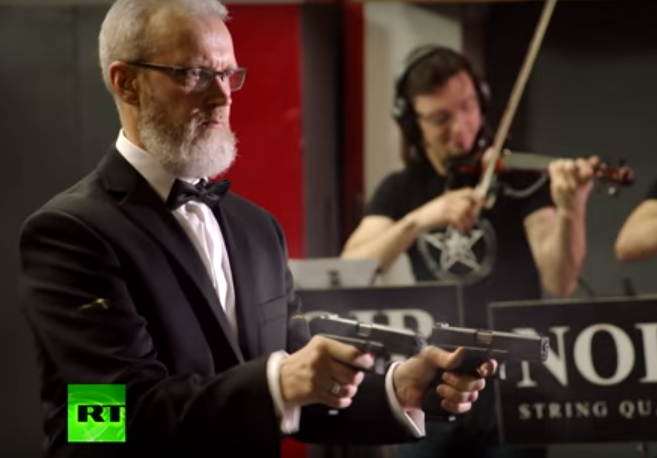 Стрелок направляет пистолеты в сторону металлических пластин. Остальные же партии исполняет струнный квартет Noir.
