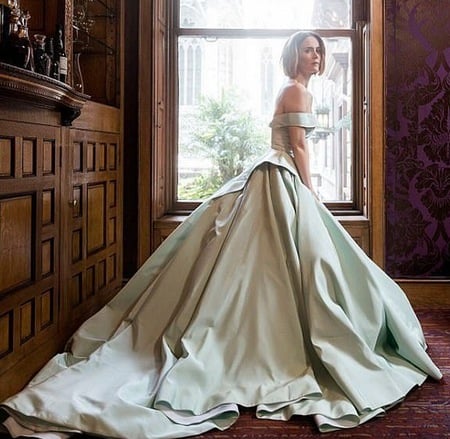Актриса позировала в длинных платьях: черно-серого и светло-оливкового цвета.