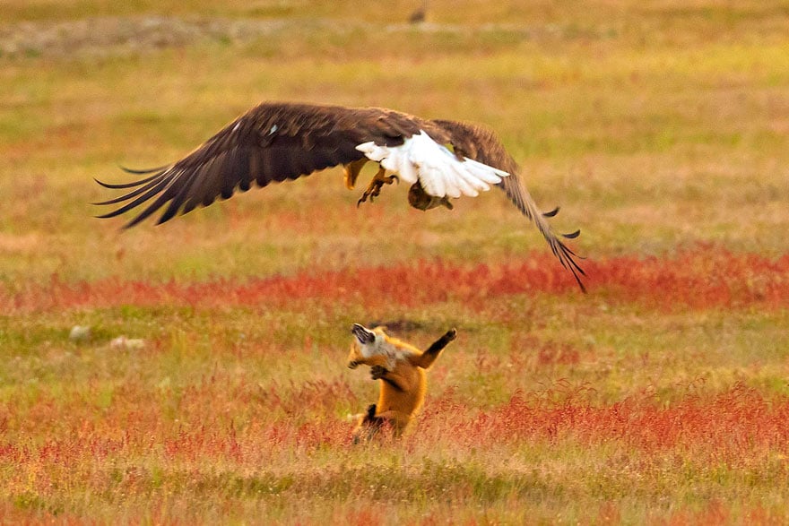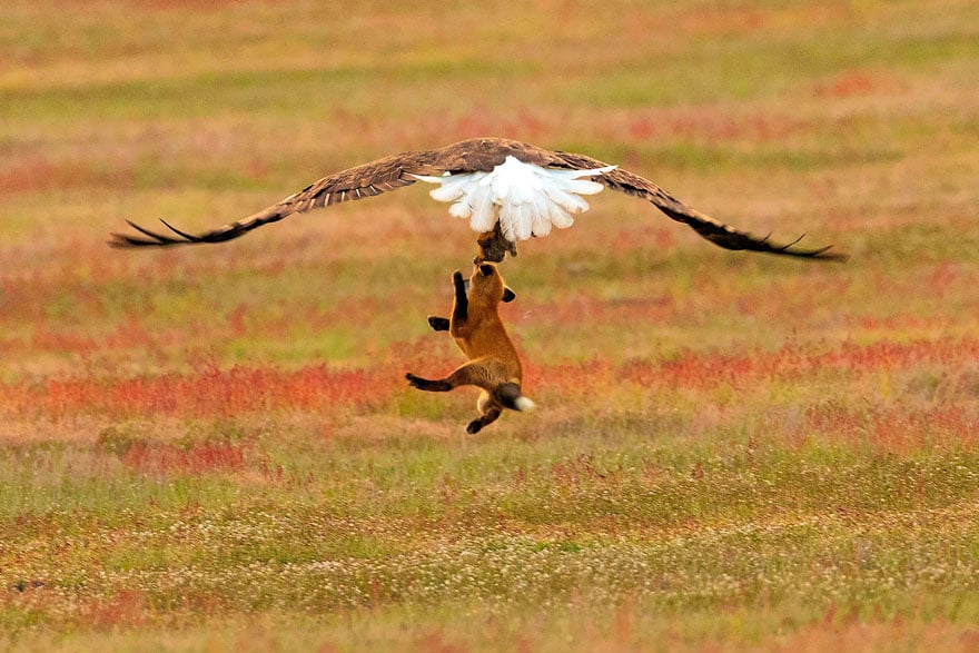 Лиса в какой-то момент поняла, что ей не победить и уступила свой трофей наглому орлу. Удивительно, но на лисе не оказалось ни царапины, и она тут же побежала дальше.
