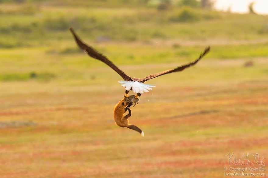 Далее события начали развиваться и вовсе драматично. Лиса не хотела отпускать свой ужин . а орел поднял в небо украденную добычу и вцепившуюся в нее соперницу. Трио взмыло в воздух на высоте более 6 метров.