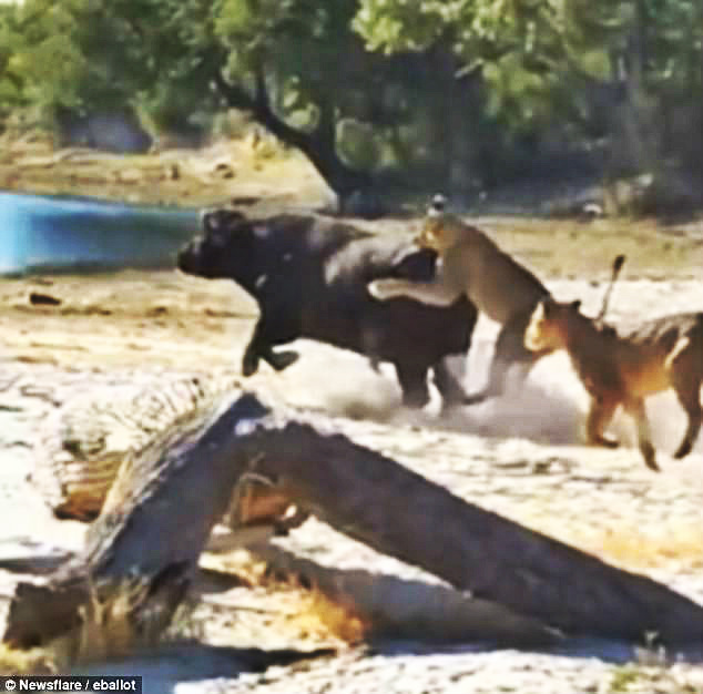 В видео показано, как буйвол, со вцепившейся в его спину львицей, добежал до реки и выбрался на сушу к другим буйволам. Они, в свою очередь, помогли ему избавиться от нападавших хищников.