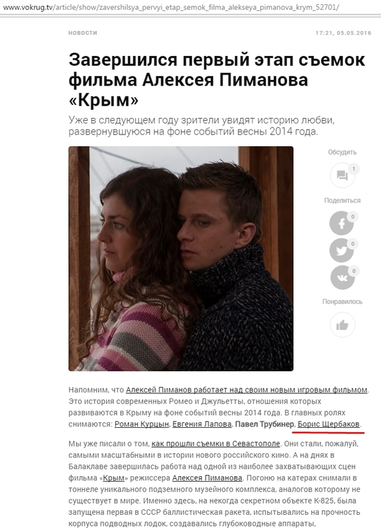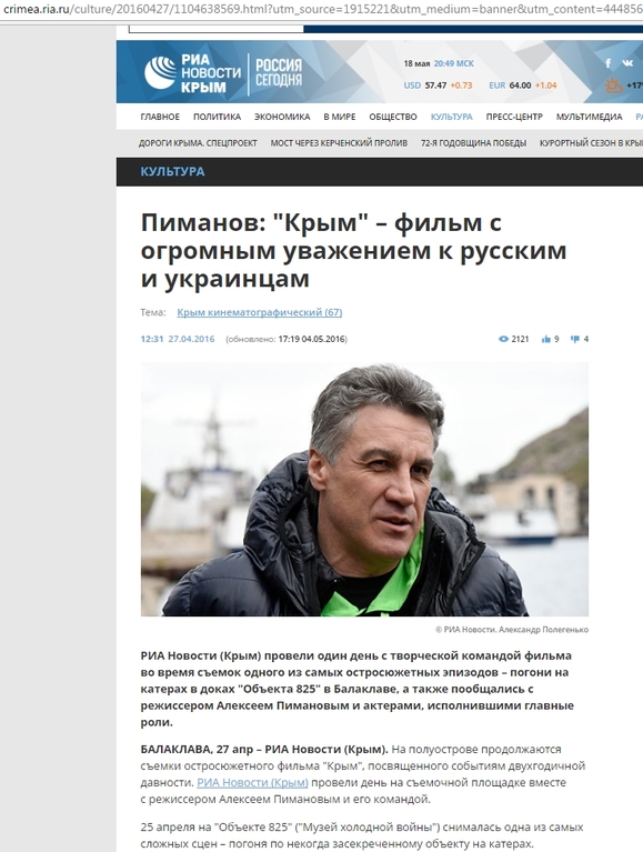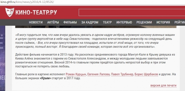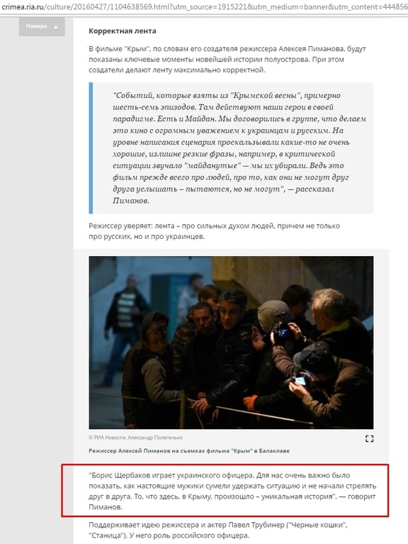 «С нарушением украинского законодательства въехал на территорию оккупированного Россией Крыма для участия в съемках пропагандистского фильма «Крым» о событиях так называемой «крымской весны» (реж. Пиманов Алексей)», — пишется на ресурсе «Миротворец». Доказательства этого приводятся из прессы.