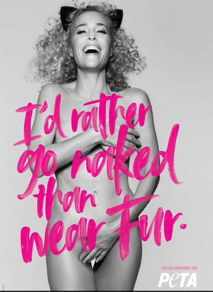 Американская актриса Джиллиан Андерсон, известная по роли агента Скалли в фильме «Секретные материалы», полностью разделась ради участия в благотворительной кампании по защите животных от PETA.