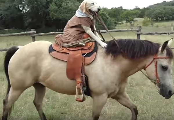 Примечательно, что у пса есть специальное седло, помогающее собаке сохранять равновесие. Мейзи управляет своим конем с помощью уздечку, которую держит в зубах.
